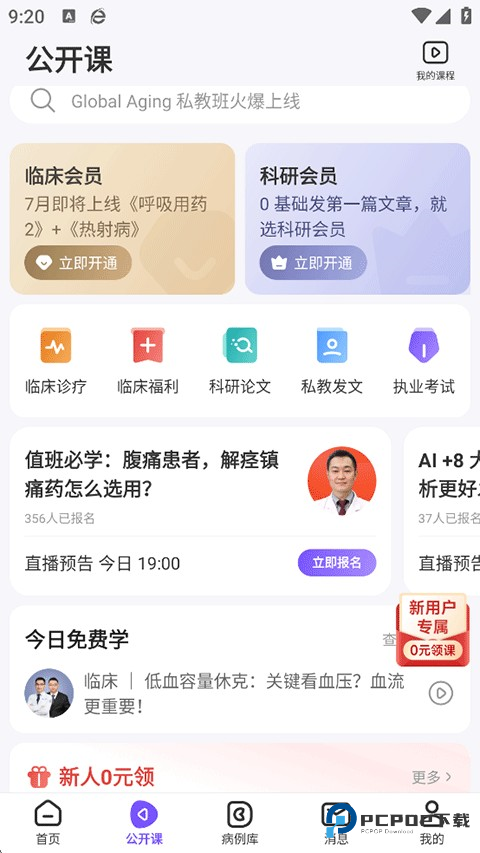 2、在公开课页面包含了众多如临床诊疗、科研论文、执业考试等课程学习资源;