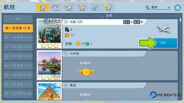 很快,您就可以管理全球的航班了!不过现在先来执行一班训练飞行吧。这里记录着玩家全部的航班计划,其中有各种各样的飞机类型,还有不同等级下的场景模拟,首先学会训练飞行,这样对于后期的航班计划可提前进行布局。