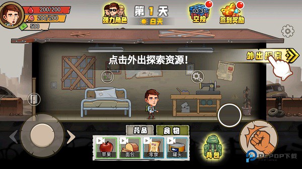 8、探索完毕后,回家,之后你便可点击床铺进行升级,或者睡觉来补充生命值。