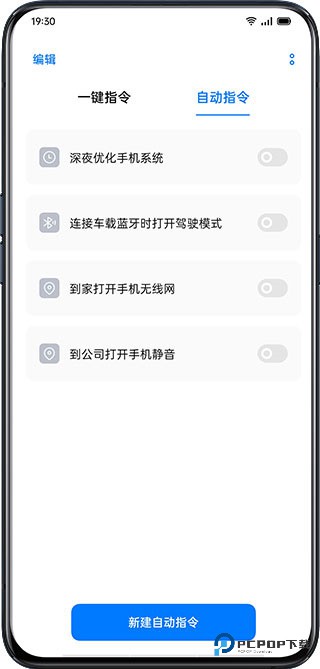 系统已经预设了几种常用指令:深夜优化手机系统;连接车载蓝牙时打开驾驶模式;到家打开手机无线网;到公司打开手机静音。