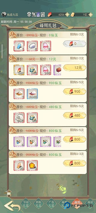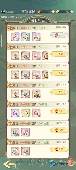 新服礼包:每天刷新。灵石买的清空!300 进阶玉可买,600 卷轴也划算(比坊市便宜)。750 徽章性价比低别碰。