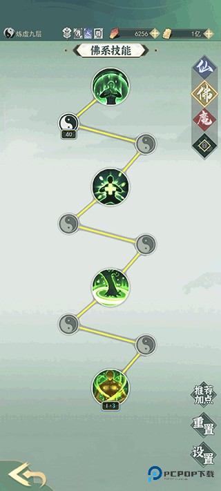 开了佛就先点佛,技能升级顺序 3421。技能点充裕后补仙、魔。第七天左右推荐这个路线。