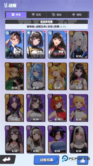 5、点下方战姬按钮升级角色,招募更多角色加成效果越强。