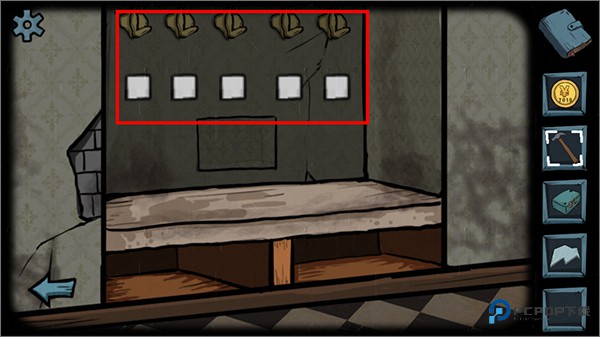 3、然后去左边房间,点击挂衣钩,按照1,4,5的顺序点击挂衣钩,打开暗格,拿到螺丝刀。