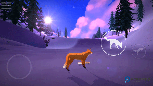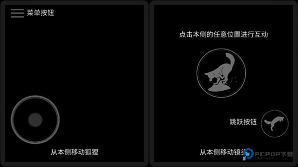 2、游戏采用横版移动操作,左侧隐形轮盘移动狐狸,右侧可以互动、跳跃、移动镜头,点击继续;