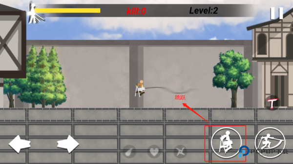 3、还没变大之前呢,轻点屏幕右侧的【跳跃图标】能让小火柴人跳起来,感觉时机对还能多按几次实现连续跳跃动作。