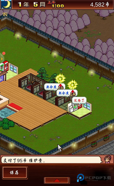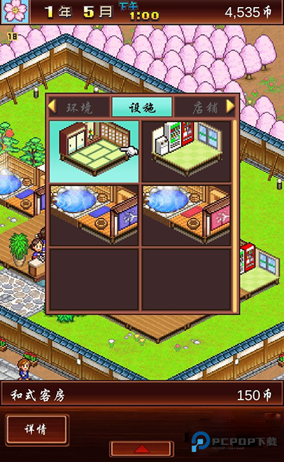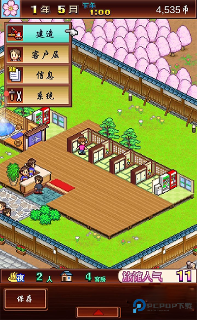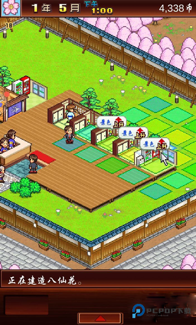 开温泉旅馆,设施小店少不了。想造新建筑?点左上角的小花,或者右下角的按钮就能打开菜单;