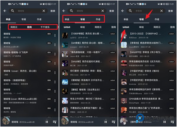 插件安装后,我们就可以直接搜索音乐了,可搜索音乐名或歌手名,支持的各个平台随意切换,针对那些讨厌的翻唱,大家可以选择“歌手--专辑”,按上图中所示点击播放即可。