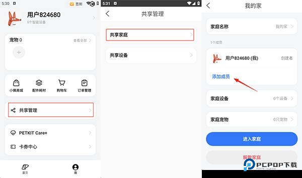 1、在本站下载安装并打开小佩宠物APP,依据操作步骤:我-共享管理-共享家庭-我的家-添加成员,将共享人员添加到设备中就可以了。