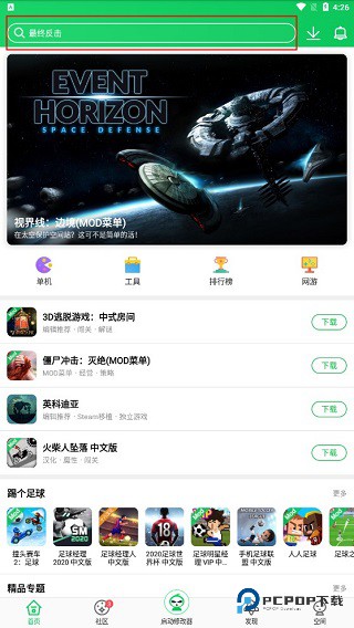 1、打开手机上的葫芦侠 APP,在首页那个搜索栏里敲游戏名字,或者到分类里面翻翻找找,找到你想玩的那款。