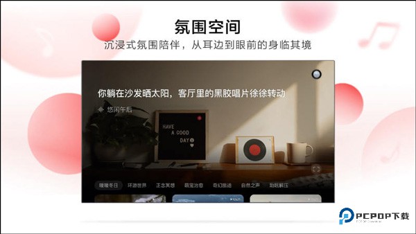 此次新增“氛围空间”功能,能在用户聆听音乐同时,电视屏幕展示各类主题背景画面,营造身临其境的沉浸式体验,如“躺在沙发晒太阳”“守在冬日暖炉边”。