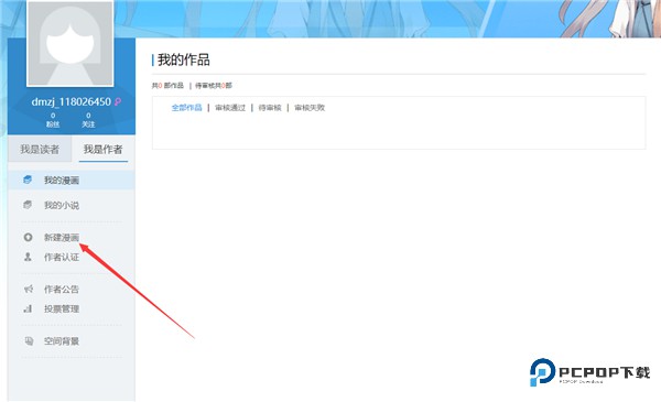 (1)通过网站右上方导航栏的“上传漫画”按钮或者个人空间->我是作者中的“新建漫画”进入漫画创建页面。