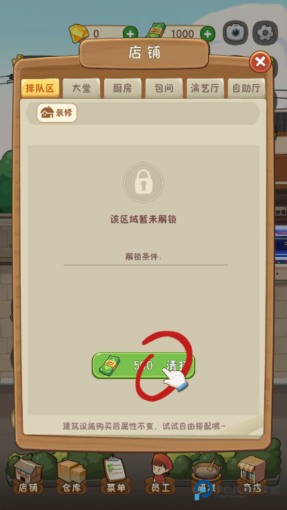 5、想要清扫店铺的话,还是要点击左下角的【店铺】,然后在弹出来的页面花300块钱清扫费;然后就是餐饮的心脏了——厨房,点击左下角的【店铺】,然后在弹出来的页面花200块钱清扫费;