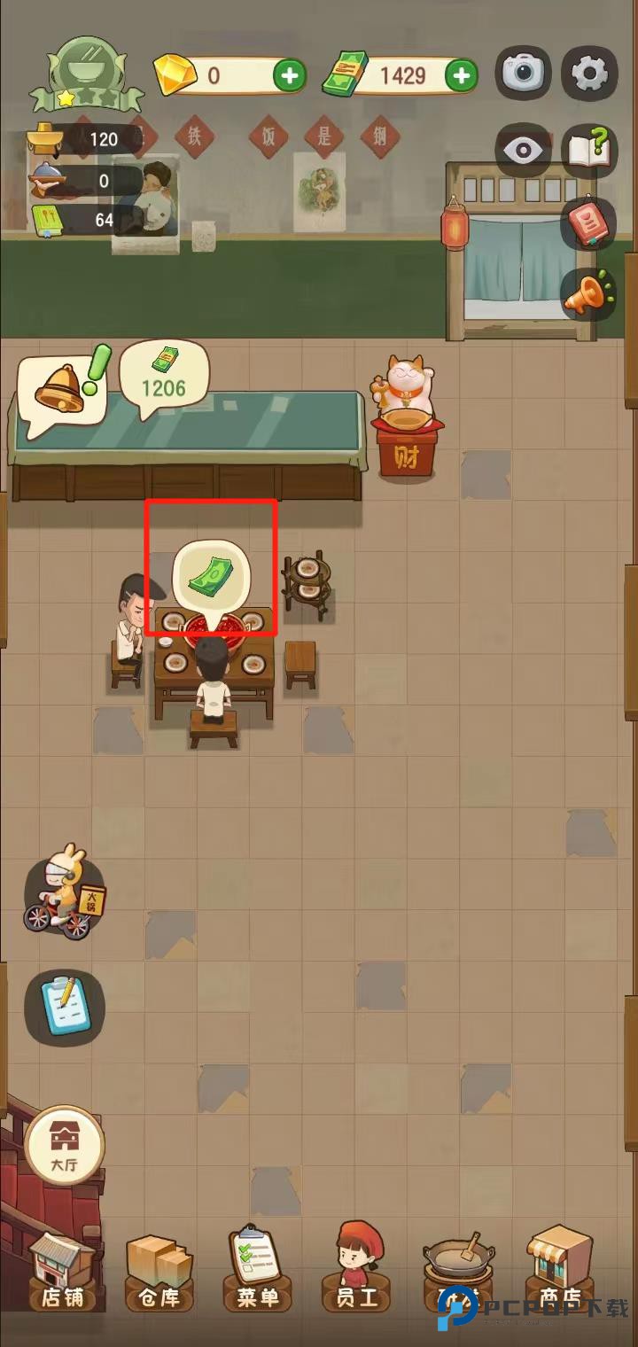 9、现在我们可以准备迎接客人的到来,客人来了,可以点击客人头上的需求,对其进行上菜;上完菜后点击客人头上的钞票就可以查看消费的金额以及所得的利润;