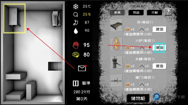 3、然后把火炉建造出来,它可以帮你消耗多余的氧气。家具是有等级的,后续可以将它们升级。