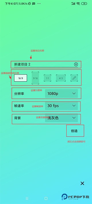 3、可以设置项目名称、宽高比例、分辨率、帧速率、背景颜色;