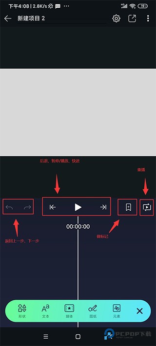 6、可以添加形状、文本、媒体(手机上的图片和音乐还有视频)、图纸、元素;
