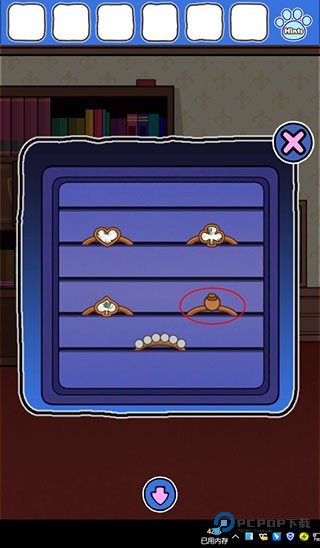 5、点击书的上面柜子,在柜子里有一个盒子打开,点击右下角没有钻石的“戒指”获得把手。