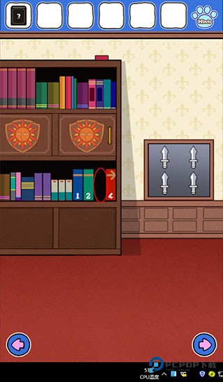 4、向右到达有书柜的房间,点击在框子里3号书放到下层空缺处,开启上方柜子。