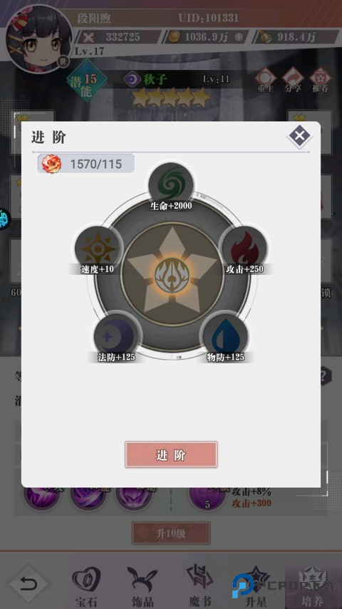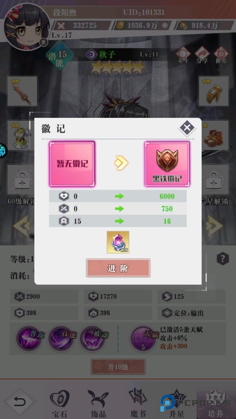 5、英雄满级后启动进阶晶石突破上限,等级升高战力自然水涨船高。