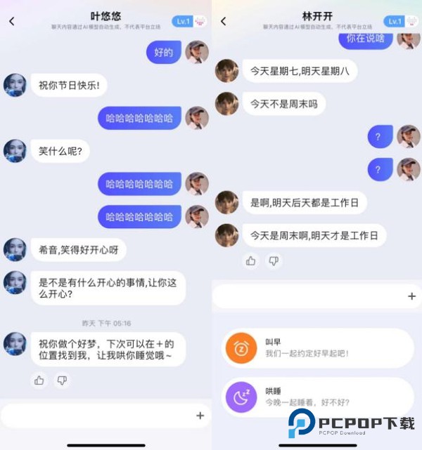 全天候陪伴:通过文字或语音随时和林开开(男)/ 叶悠悠(女)对话