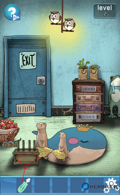 1、点击如图所示位置小动物手里面的螺丝刀。之后使用螺丝刀将左下角的柜子打开。