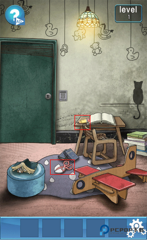 1、首先来到第一关,点击拿走地面上的剪刀还有木桌子上的铅笔。