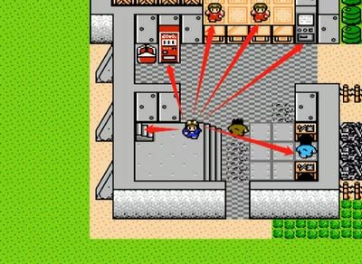 如图,箭头按顺时针从左往右顺序说明:(说明:以后的城镇以此类推,多与人对话或对某些地方调查有不同信息或发现,玩家自行体会。)