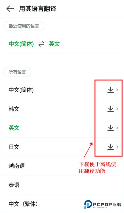 2、点击上方相对应图标即为对应翻译功能,例如“中韩翻译”,如果想要离线使用翻译功能,可以选择是否下载语言包,如下图: