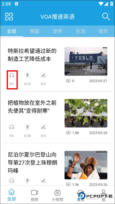 1、打开VOA慢速英语App,在“全部”界面中选择你想听的内容选择并点击红色方框内的选项;