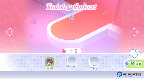 4、新手引导对话结束后触发首演任务:点击大厅的 "Concert" 按钮进入演出界面,按下 "play" 开启舞台。注意实时点击飘动的爱心和金币!