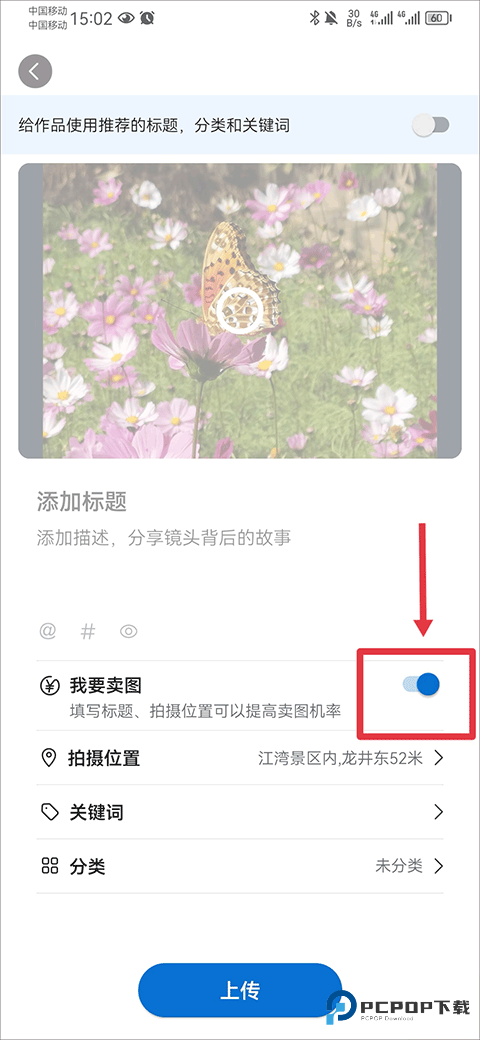 4、最后在作品上传界面中将作品标题、描述、分类等完善后,将我要卖图功能开启。提交后就可以等待卖家购买啦