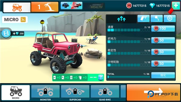 1、进入游戏后我们可以点击右侧升级来给车辆进行性能提升;