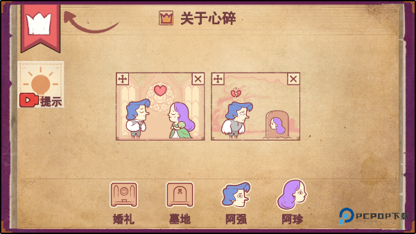 先将婚礼拖入到左边框中,然后把阿强和阿珍也拖入到左边框中结婚,之后把墓地拖入到右边框中,再将阿强也拖入到右边框的坟地旁,把阿珍拖入坟地里,便通关成功了,这样讲述的就是阿强和阿珍进入婚礼的殿堂,几年之后阿珍死了,阿强心碎了。