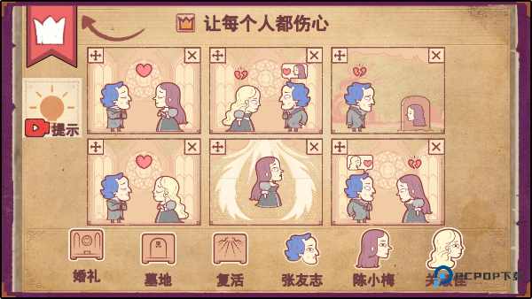 第六步把婚礼拖入到最后一个框中,将陈小梅和张友志拖入,陈小梅复活了,而丈夫和别人结婚了,她很伤心,这样便构成了一个三角虐恋,他们三个人都伤心了,我们便通关成功。