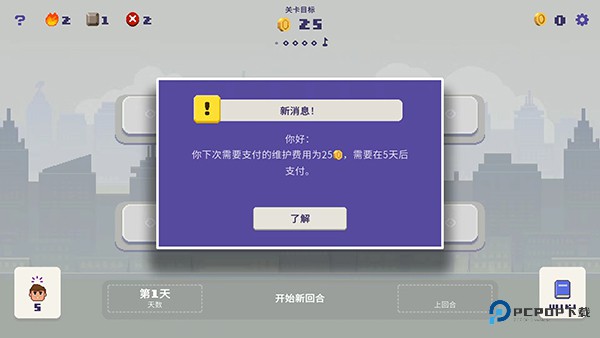 2、游戏中是以天数为进度的,消息提示我们需要在5天后支付25金币的维护费用,点击【了解】即可继续,