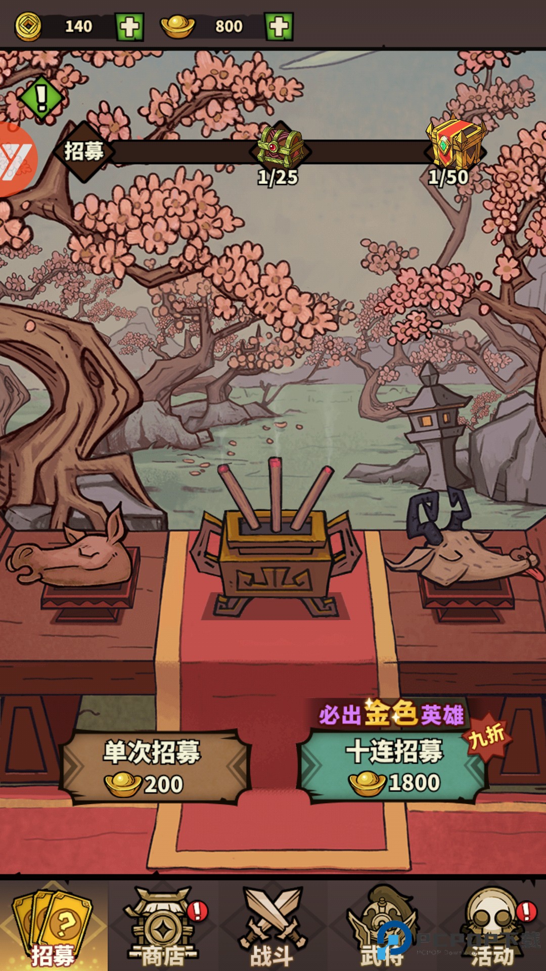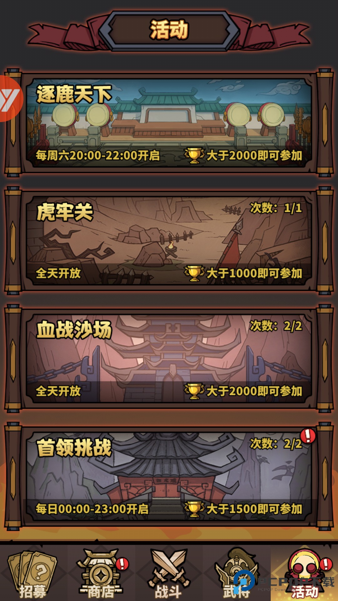 2、进到主界面,看到这几个主要地方:【招募】、【商店】、【战斗】、【武将】、【活动】。