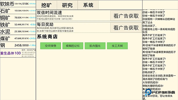 1、刚接触重生挖矿,核心就是资源的获取与调配。玩家只需点按屏幕上的 “挖矿” 按钮,模拟真实开采,由此获得各类基础矿石。这些初始物资至关重要,它们是推动科技研发和建造各式设施的基础原料哦。