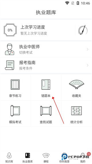 1、打开中医通APP,在软件的“执业题库”的功能界面下可以看到“错题本”的功能选项,点击进入即可;