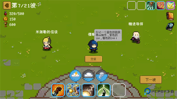 6、抵御这波攻击就会有角色过来交谈,点击交谈可获得一些道具,还可以卖掉一些道具,交谈完毕可以点击下一波