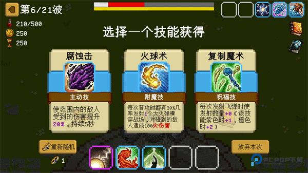 5、每泼抵御怪物攻击即可获得技能,玩家需要再三个技能中选择一个