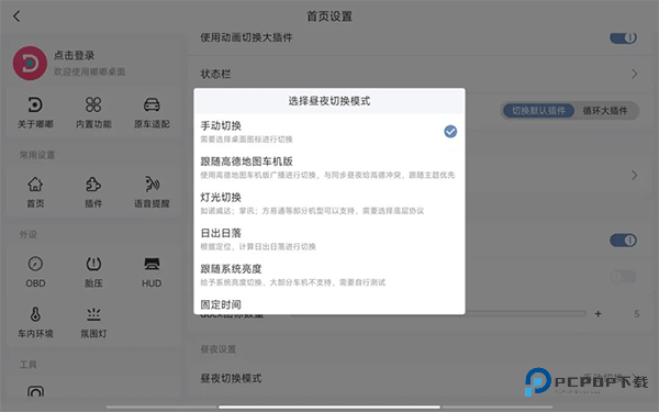 白天黑夜切换模式也可以自定义,包括手动切换,跟随高德地图车机版、日出日落,固定时间,部分车型还可以根据灯光和系统亮度自动切换。