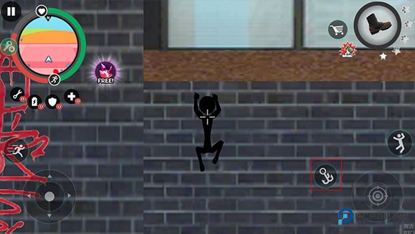 5.左右摇杆控制火柴人移动,右边的技能可以发出绳索,在大楼之间自由穿梭。