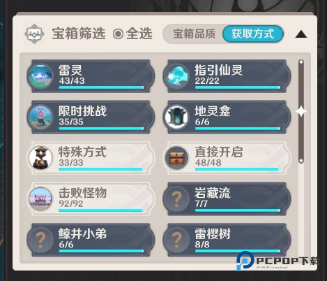 宝箱筛选中,可通过两种维度:【宝箱品质】、【获取方式】筛选。两种筛选全选后均显示仅该区域全部【宝箱、宝箱相关】点位。