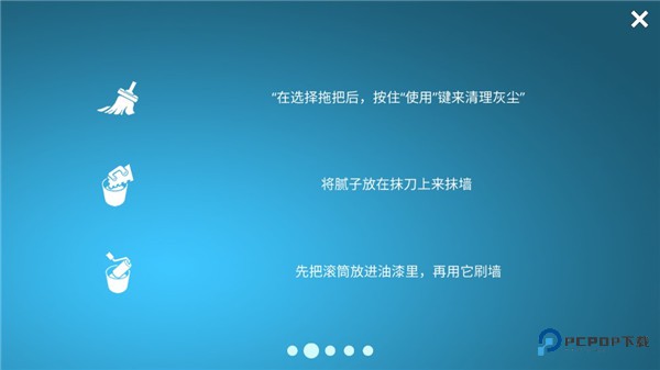 4、在选择拖把后,按住"使用"键来清理灰尘,将腻子放在抹刀上来抹墙,先把滚筒放进油漆里,再用它刷墙。