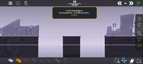 3、完成新手教程后就可以正式开始游戏了,玩家需要使用左下方的材料搭建桥梁;