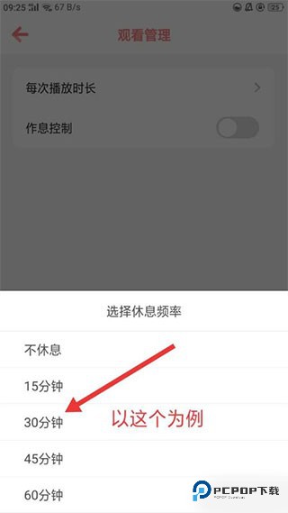 4、然后下面弹出选择休息频率对话框,这里以选择30分钟为例,点击该选项。