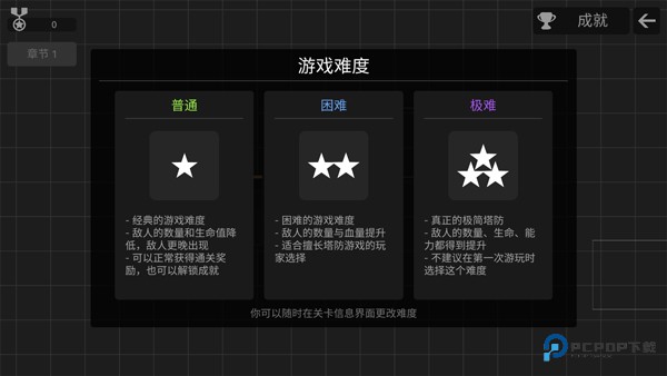 1、打开极简塔防,点击开始游戏,选择游戏难度,现有普通、困难、极难三张难度;