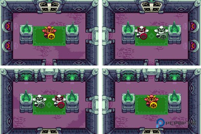 从台上跳下,向左回到暗之海拉尔城的入口处,用钥匙打开右边的门,进入(下楼)。沿着走廊径直来到有四个骷髅的屋子,按图9所示分身反弹炮弹,即可继续通行。
