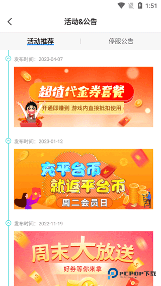 7、点进活动公告,可以看到有活动推荐以及停服公告,在活动推荐里可以看到软件推出的优惠活动,在停服公告里可以查看各个游戏的停服公告具体内容。